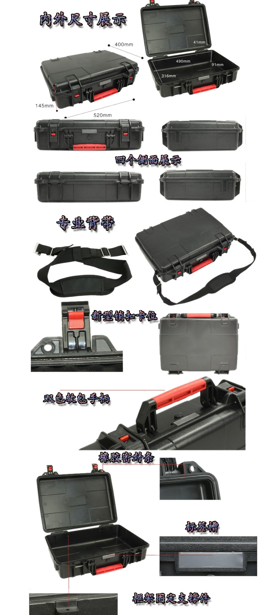 簡(jiǎn)要說(shuō)明:廣泛用于傳媒、公安、消防、軍隊(duì)、航空、戶外攝影、野外考察、科學(xué)探測(cè)等眾多領(lǐng)域的高端儀器、儀表。具有高強(qiáng)度、高抗壓沖擊、防潮、絕對(duì)密封、防塵、防水等特點(diǎn)。產(chǎn)品材質(zhì):ABS原料,箱體采用高抗沖擊的高分子聚合材料一體注塑成型,密封采用扁型彈性發(fā)泡密封橡膠條,確保防水氣密,所有較軸均采用不銹鋼材質(zhì)。