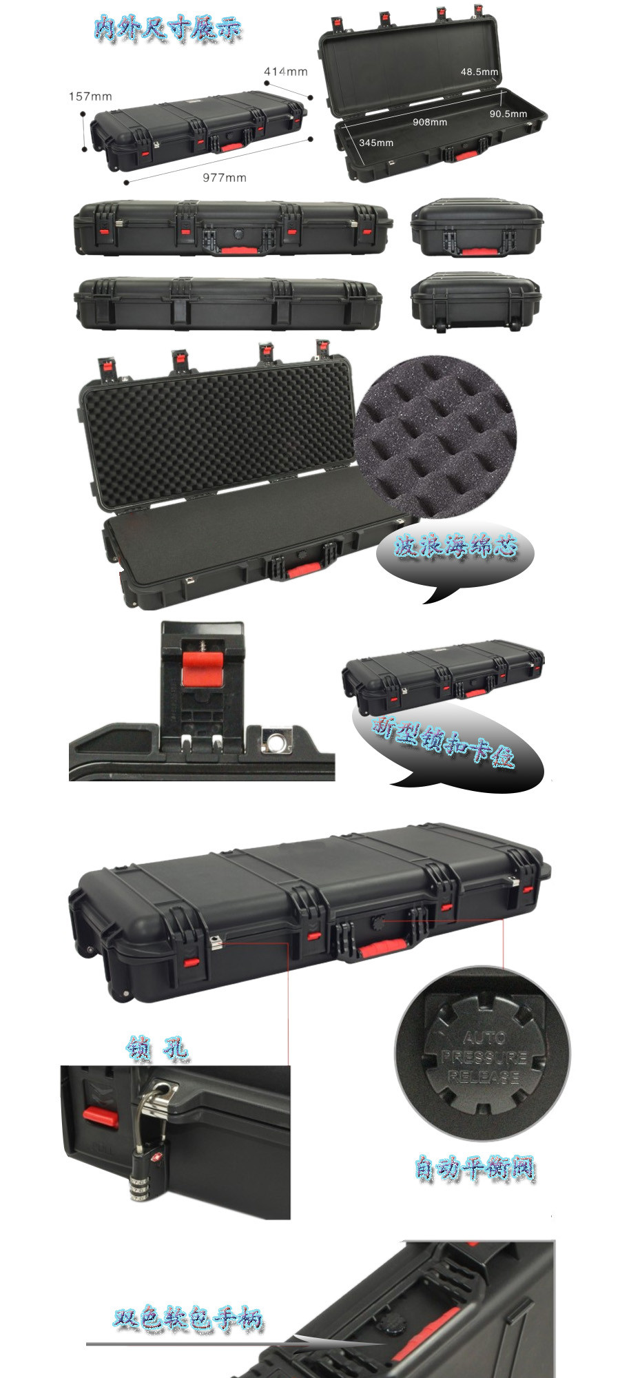 簡(jiǎn)要說(shuō)明:廣泛用于傳媒、公安、消防、軍隊(duì)、航空、戶外攝影、野外考察、科學(xué)探測(cè)等眾多領(lǐng)域的高端儀器、儀表。具有高強(qiáng)度、高抗壓沖擊、防潮、絕對(duì)密封、防塵、防水等特點(diǎn)。產(chǎn)品材質(zhì):ABS原料,箱體采用高抗沖擊的高分子聚合材料一體注塑成型,密封采用扁型彈性發(fā)泡密封橡膠條,確保防水氣密,所有較軸均采用不銹鋼材質(zhì)。